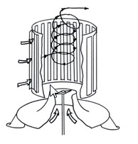 a cylindrical tower which entrains it into a tornado-like vortex. The vortex