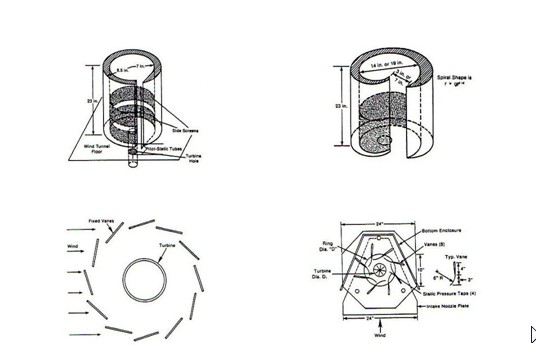 The models tested fell into 2 general categories: uni-directional and omni-directional. The two top models above are uni-directional (one circular and one spiral). The two bottom models are omni-directional (one fixed vane and one flexible vane).